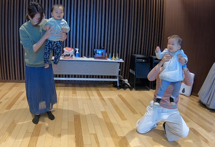 0歳〜1歳のベビークラスでは、お父様お母様と一緒にとにかく「大きく体を使って」音楽を感じたり表現することを意識して、「音楽の楽しさ」や「リズム感」を育んでいきます。