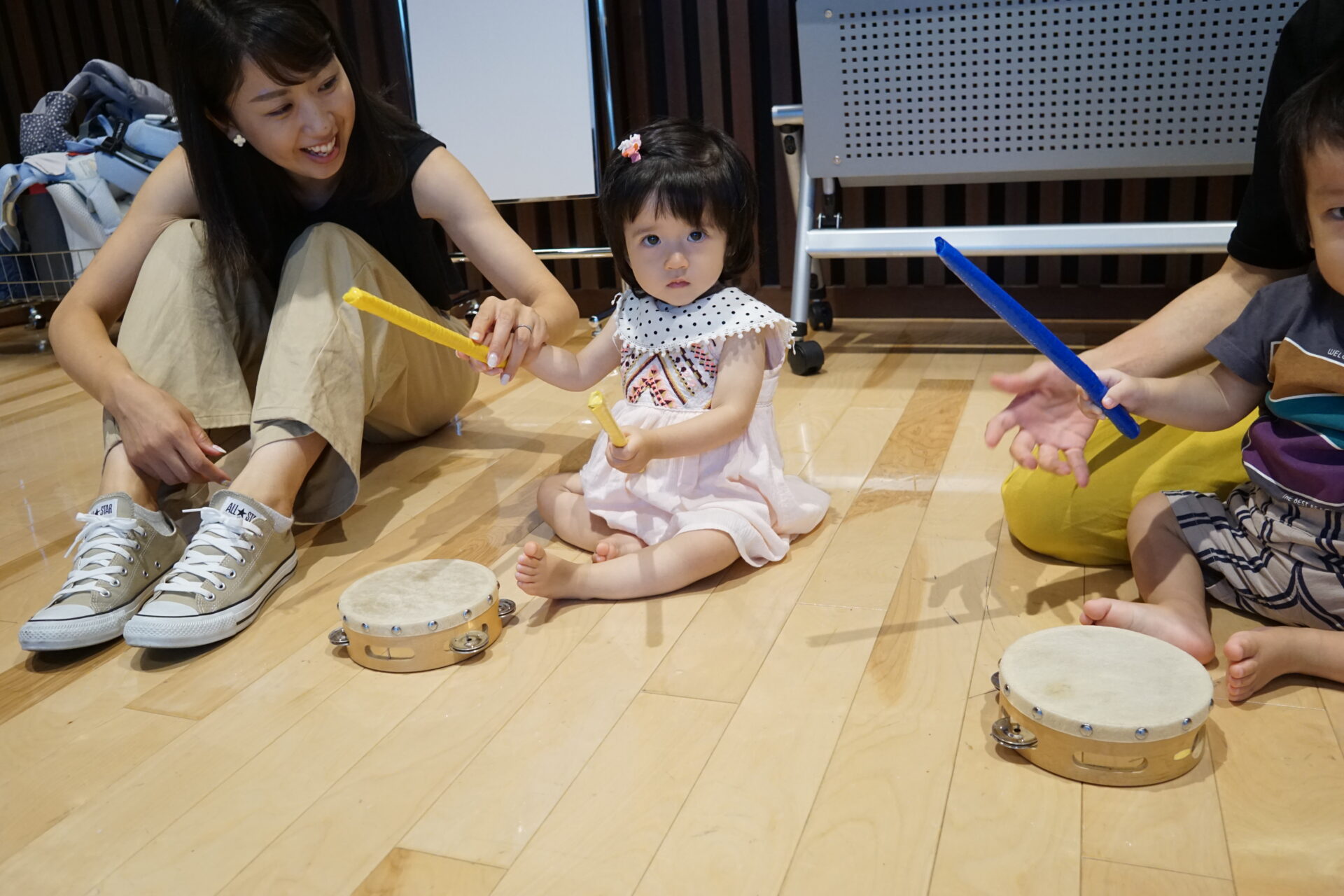 打楽器やかわいいアイテムを取り入れて「音感」のトレーニングも0歳からしっかりと取り組んでいます。